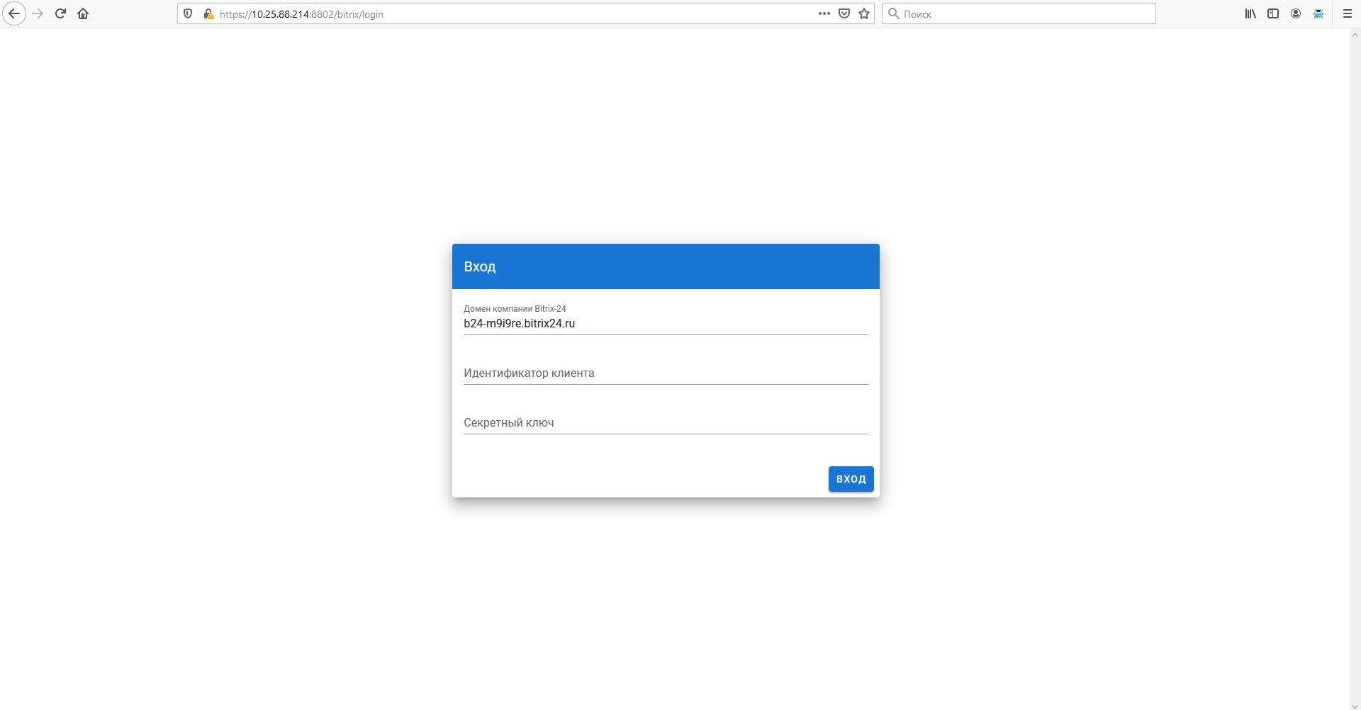 После нажатия кнопки "Вход" браузер будет переадресован на страницу авторизации Битрикс-24. После успешного прохождения авторизации, Вы попадёте в интерфейс настройки компании ecss-crm-server.