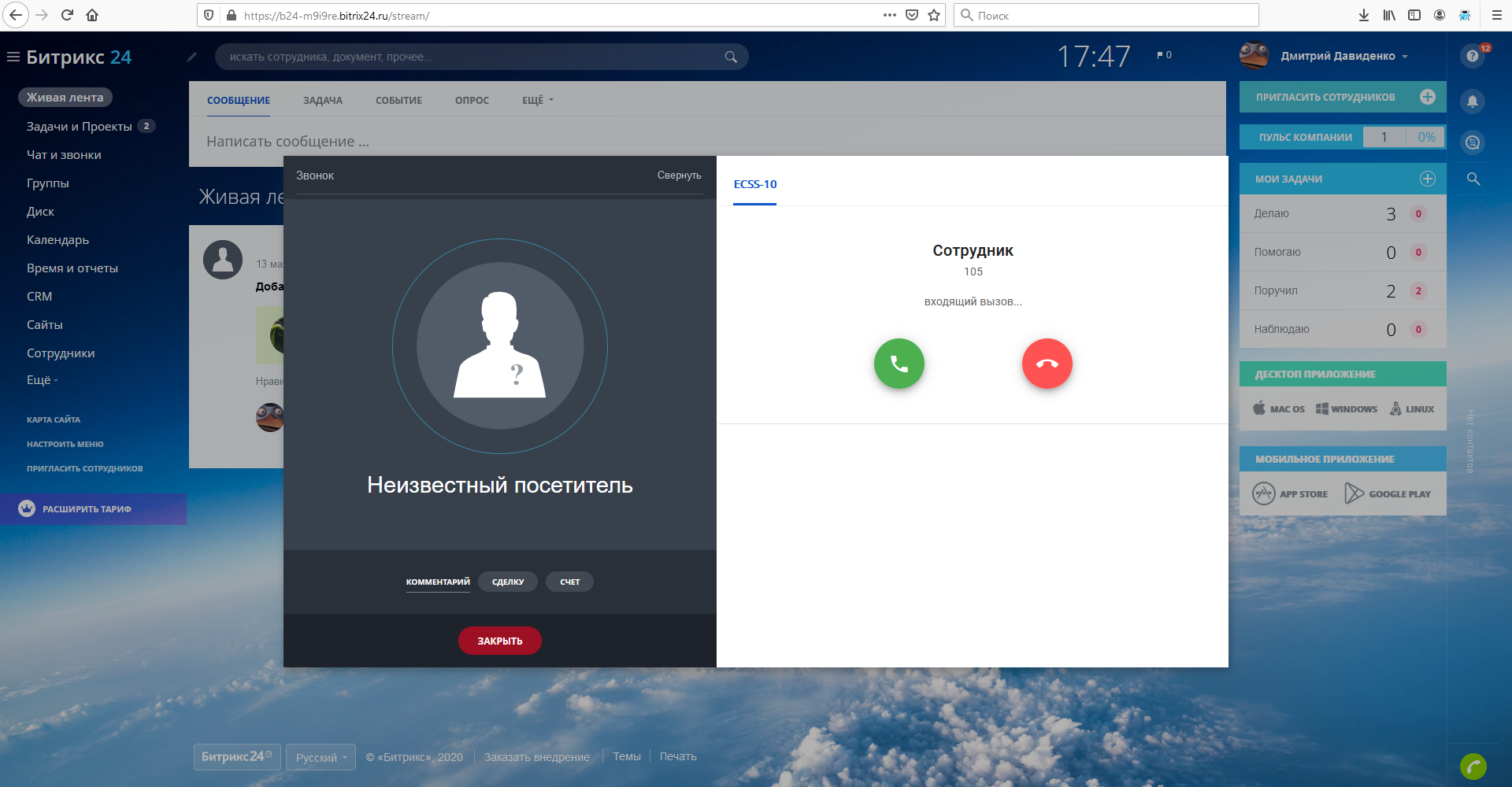 Если всё настроено правильно, то пользователь при входящем или исходящем вызове, должен видеть карточку вызова. Левая часть карточки предоставляется самим Битрикс-24 и содержит интерфейс по управлению контактом. Правая часть карточки принадлежит интеграции с ECSS-10 и содержит номер звонящего (имя, отображаемое на телефонном аппарате) и кнопки управления вызовом: "Отклонить" и, если это входящий вызов, "Принять".