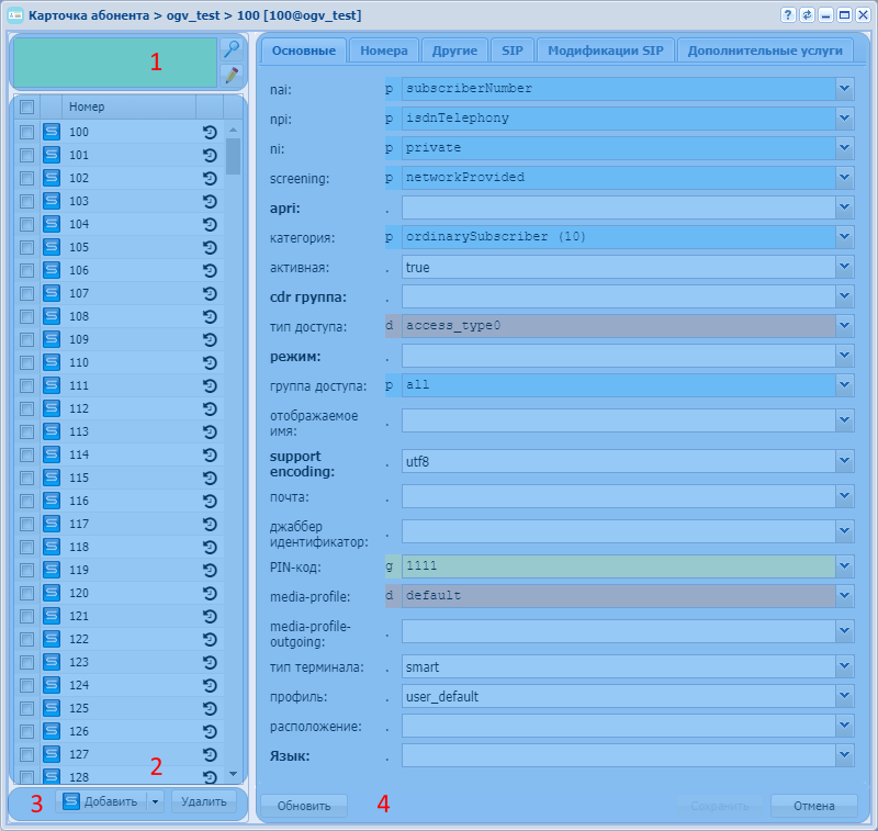 4. Панель настроек параметров абонента. На панели настроек параметров можно просмотреть и изменить индивидуальные настройки абонента, а также назначить определенный профиль.