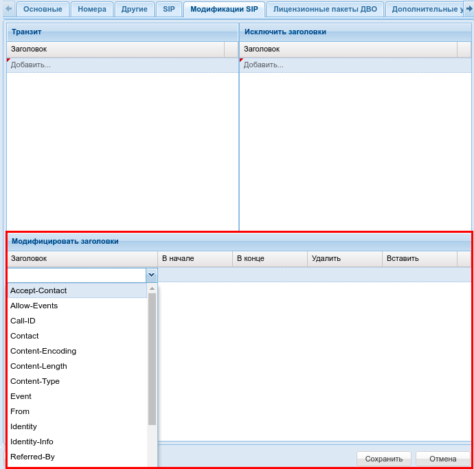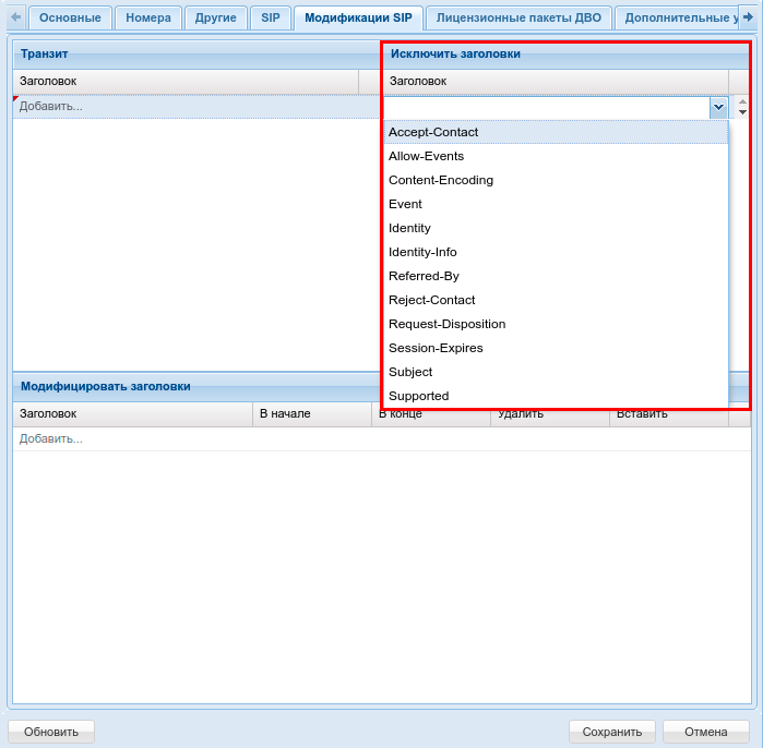 Для исходящего интерфейса можно задать список заголовков SIP-сообщений, которые не должны отправляться.