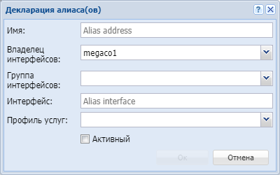 • Интерфейс (Interface) — имя интерфейса (список интерфейсов), задается в виде acp:p/номер_порта(ов)@имя MEGACO-шлюза;