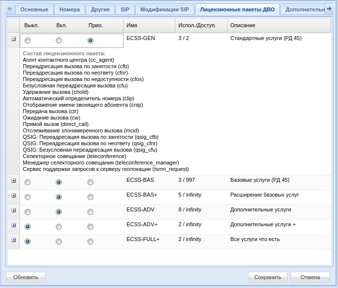 Для каждого пакета имеется переключатель. У переключателя есть три значения: "выключено"/"включено"/"включено приоритетно". Отличие "включено" от "включено приоритетно" в следующем: если лицензия деградирует (например было 10 лицензий на пакет ДВО, а стало 5), то тогда у каких-то абонентов надо пакет отключить.