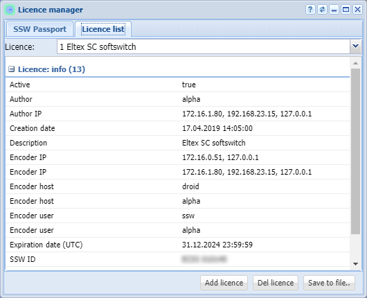 В закладке "Список лицензий" ("Licence list") можно просмотреть информацию по интересующей лицензии, добавить или удалить лицензию.