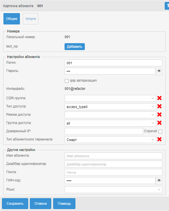 - Контакт — идентификатор SIP-интерфейса, формируется в виде number@domain, где number — номер абонента, domain — домен регистрации (SIP-домен). Не редактируется (информационное);