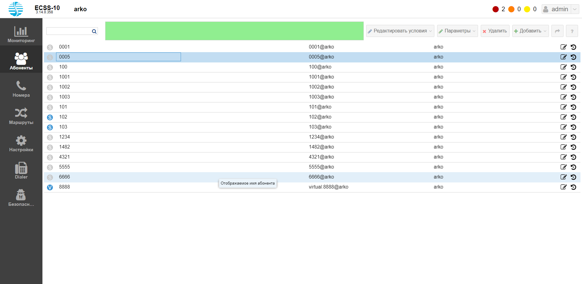Можно отфильтровать список абонентов по разным критериям. Условия вводятся в зеленом поле вручную или с помощью редактора условий при нажатии кнопки "Редактировать условия"("Edit conditions"):