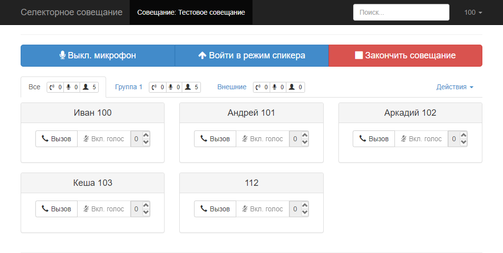 - Выключить голос для группы — выключается голос у всех абонентов выбранной вкладки группы.