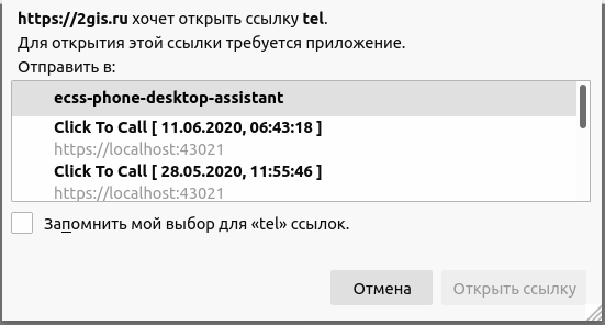 Можно выбрать обработчик «ecss-phone-desktop-assistant». Кликнуть на чекбокс, чтобы «Запомнить мой выбор» для открытия ссылок «tel:».