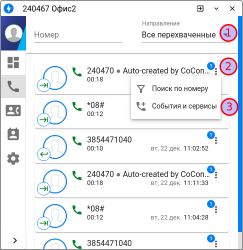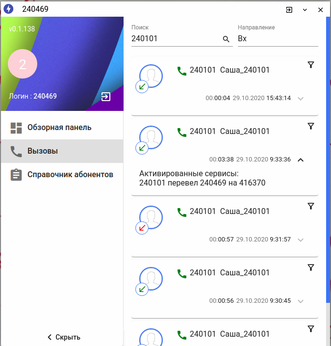 Вызовы (Calls) — страница истории вызовов с настраиваемым фильтром. Фильтр работает по неполному совпадению.