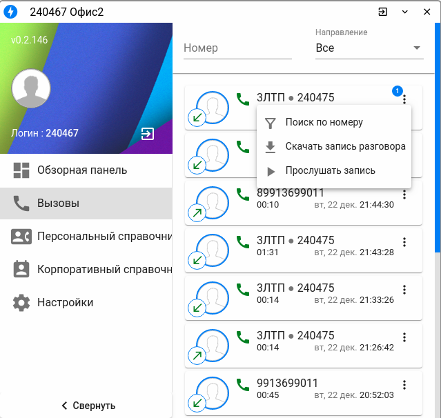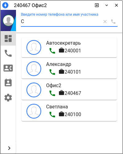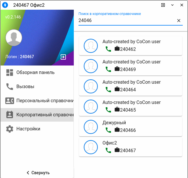На вкладке «Корпоративный (Персональный) справочник» можно выбрать номер для вызова. Работает поиск как по имени, так и по номеру.