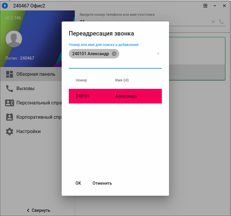 В появившемся поле нужно ввести номер или имя абонента, которому необходимо перевести вызов, выбрать из списка, нажать иконку «+» и кнопку «OK».