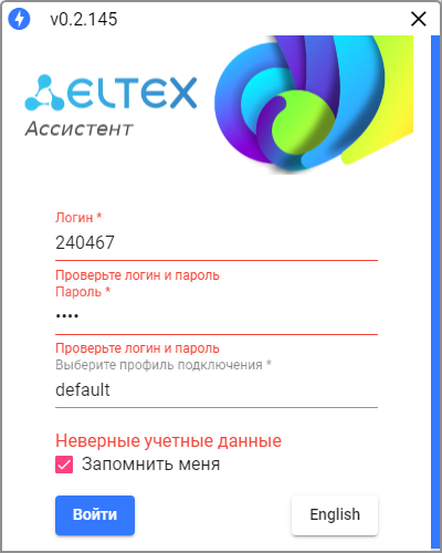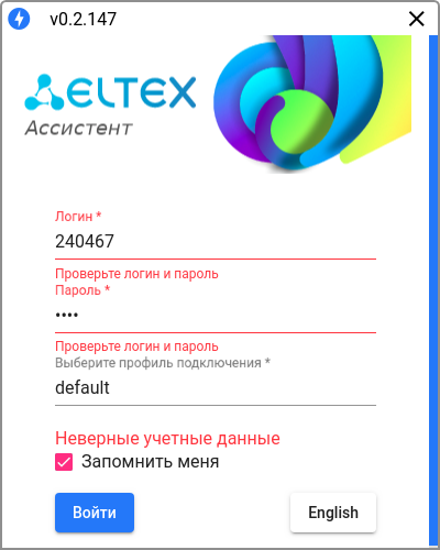 При вводе неправильного логина или пароля приложение выведет ошибку: