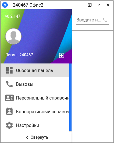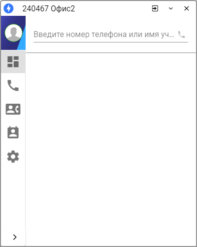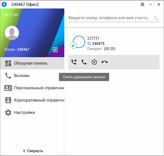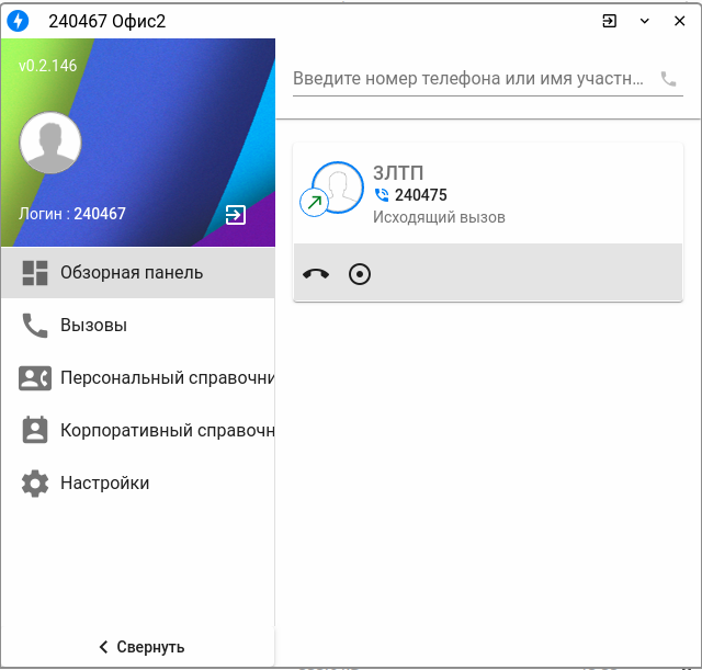 Обзорная панель (Dashboard) — основная рабочая зона приложения. Здесь можно сделать или принять вызов, переадресовать, поставить на удержание и включать/отключать запись разговора.