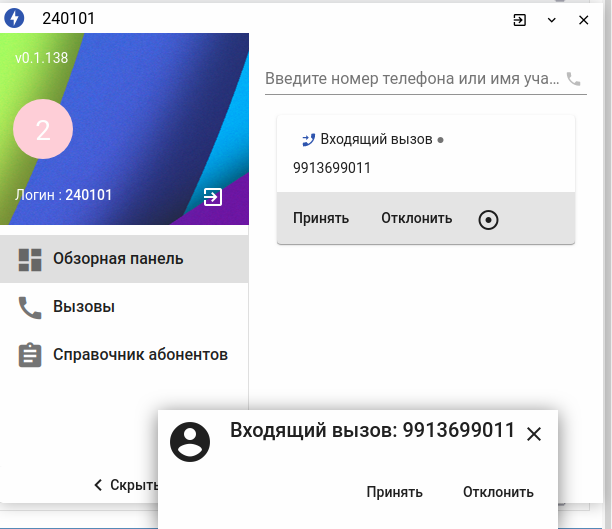 В приложении можно принять входящий вызов. Окно может быть свернуто в трей, но при поступлении входящего вызова выходит всплывающее окно, где можно принять или отклонить вызов.