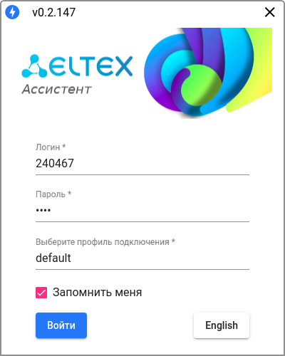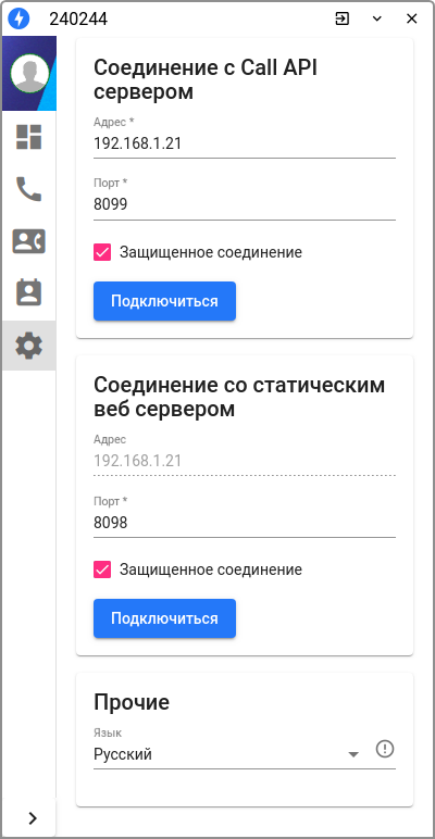 На вкладке настроек можно изменить настройки соединения с сервером, а также выбрать язык интерфейса (русский или английский).
