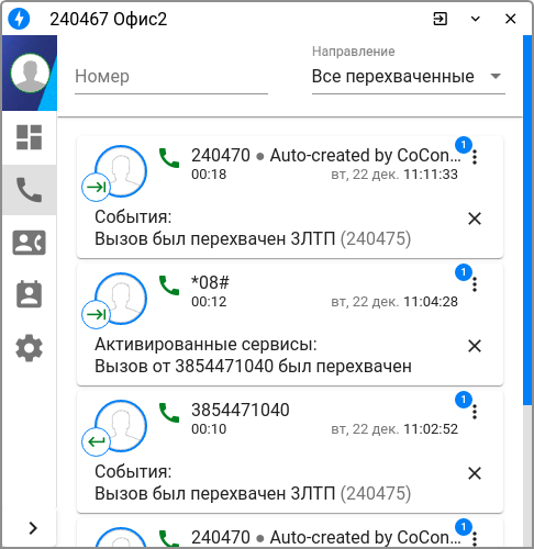 Услуга перехвата вызовов для пользователя должна быть активирована администратором виртуальной АТС. Описание услуги приведено в разделе Перехват вызова (Pickup).