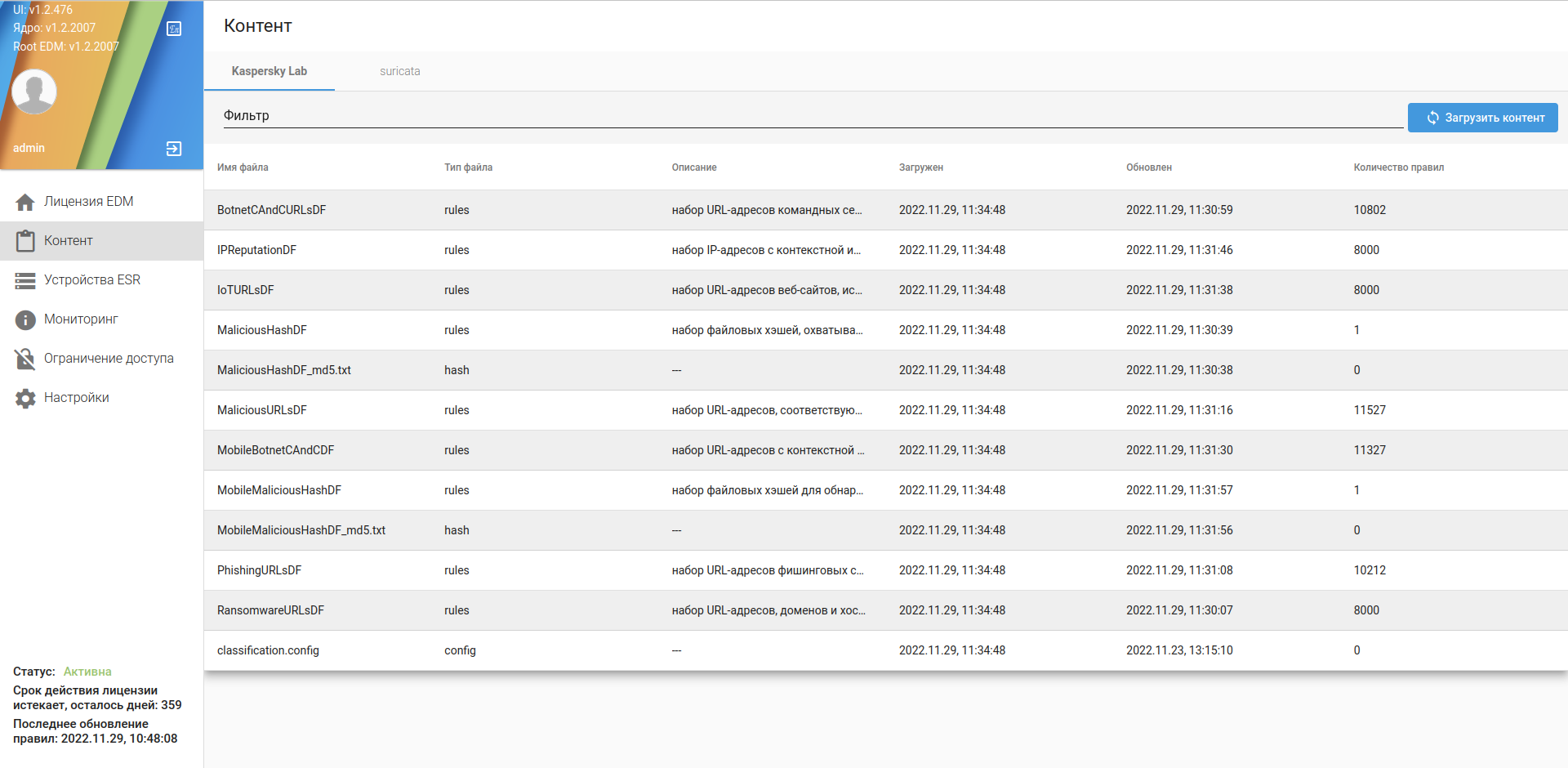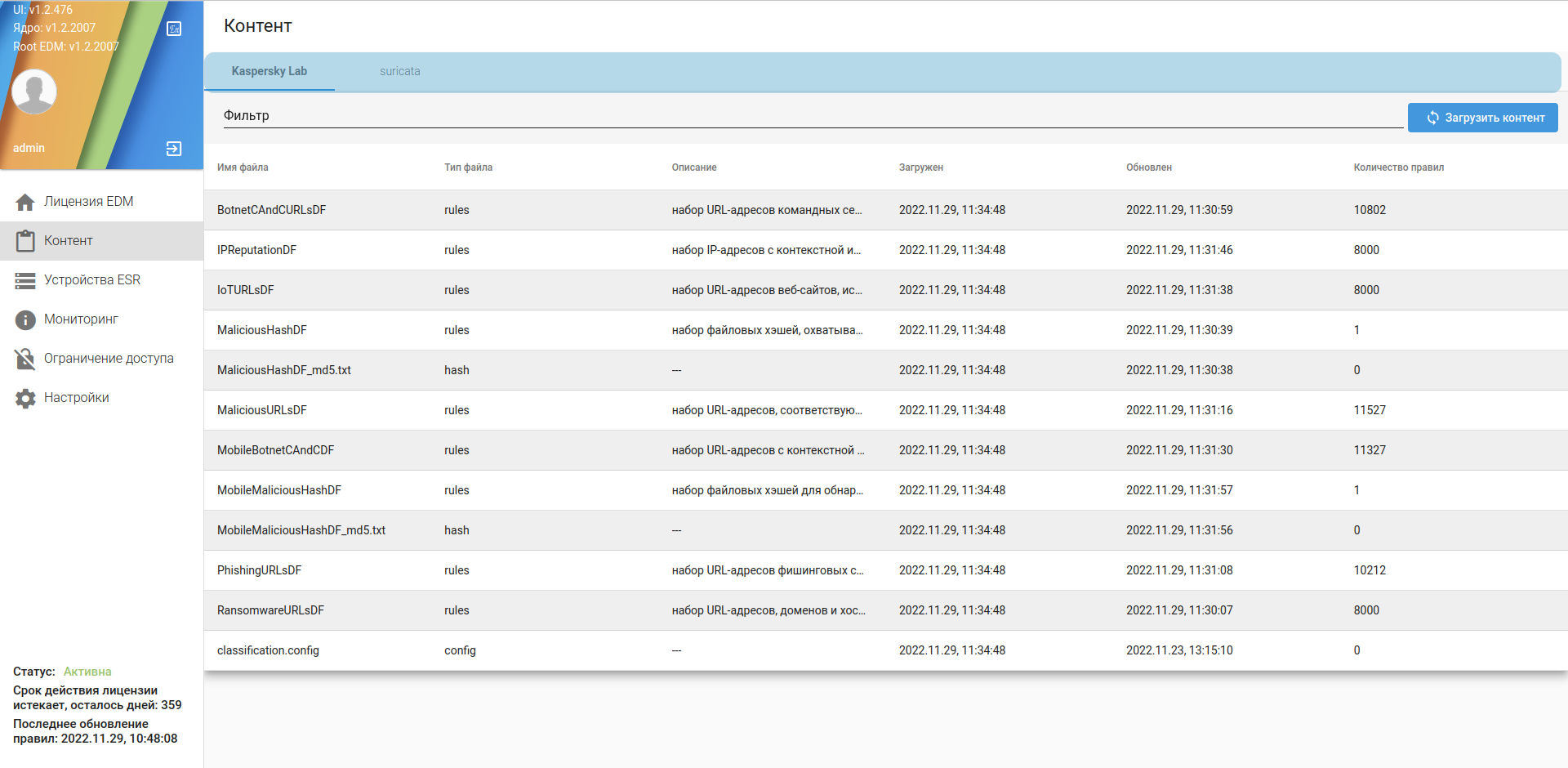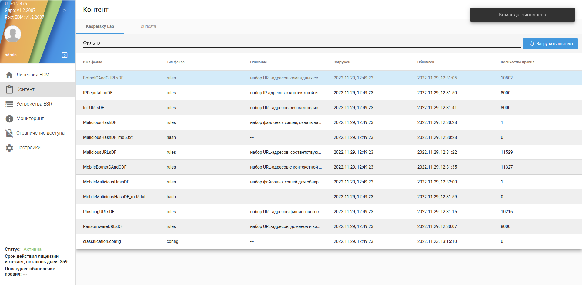 4. Нажать кнопку "Загрузить контент" в правой верхней части web-интерфейса. После нажатия кнопка станет неактивной на время процесса загрузки IDS/IPS-правил, а по его окончании в правом верхнем углу появится всплывающее оповещение о результатах процесса синхронизации.