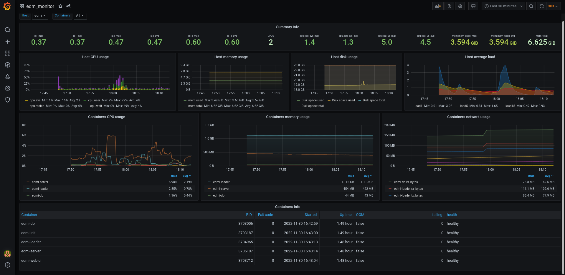 Панель мониторинга "edm_monitor" предоставляет администратору EDM Issue общую информацию о хосте, в котором запущен EDM Issue, а также информацию о Docker-контейнерах EDM Issue.