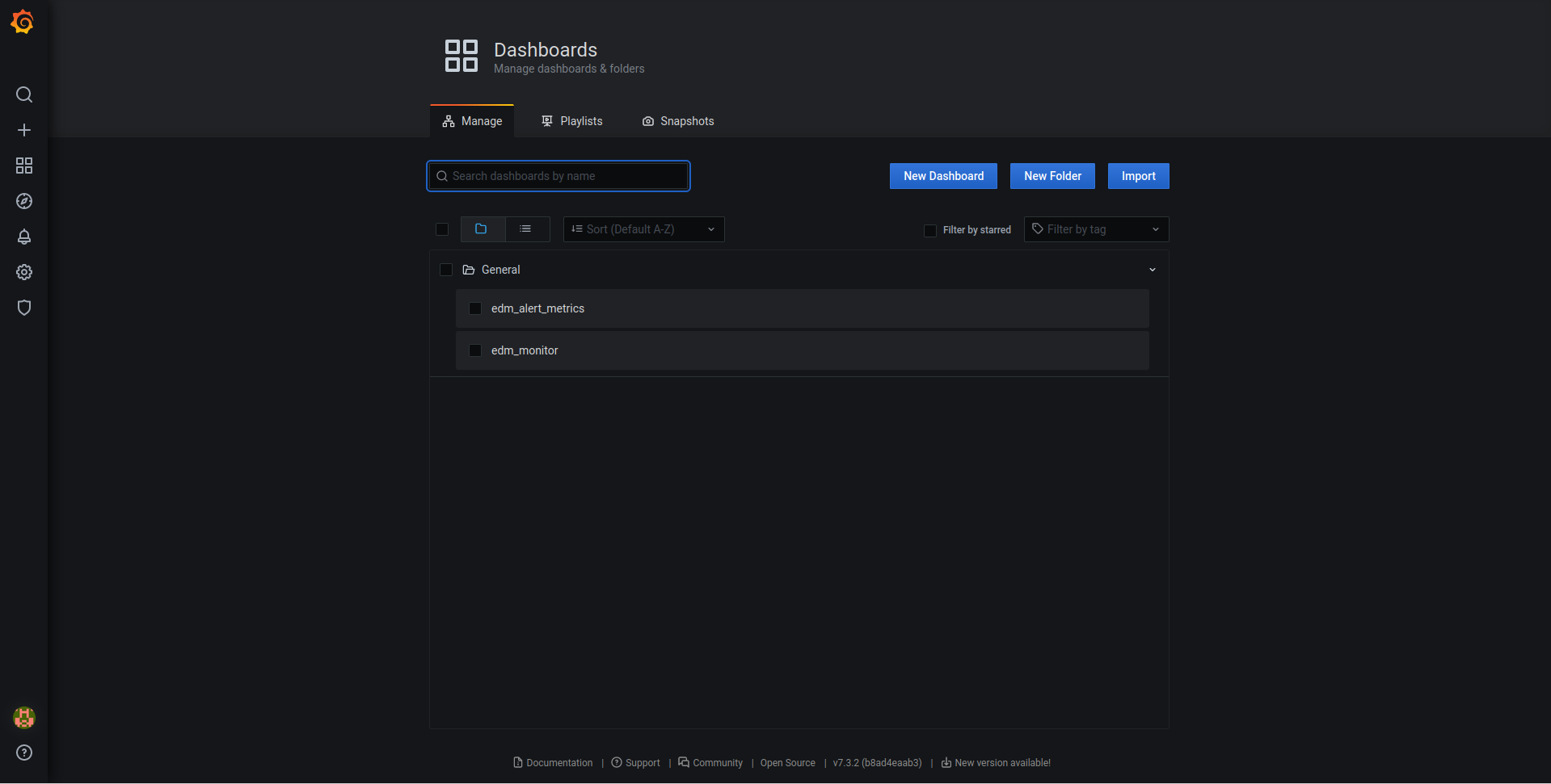 После авторизации в web-интерфейсе Grafana для доступа к данным мониторинга с EDM Issue требуется перейти в раздел "Dashboards" – "Manage". В этом разделе в директории "General" будет располагаться две панели мониторинга – "edm_alert_metrics" и "edm_monitor".