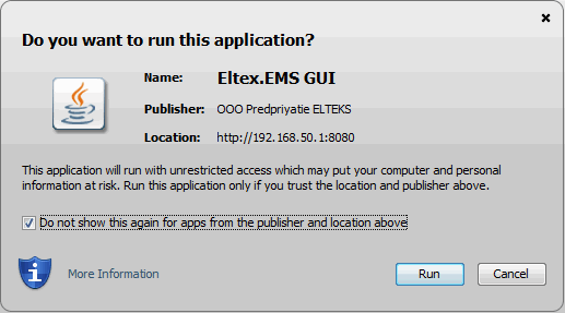 Чтобы на рабочем столе появился ярлык для открытия GUI EMS, необходимо включить хранение временных файлов в Java Control Panel. Запустите на исполнение скачанный файл формата .jnlp.