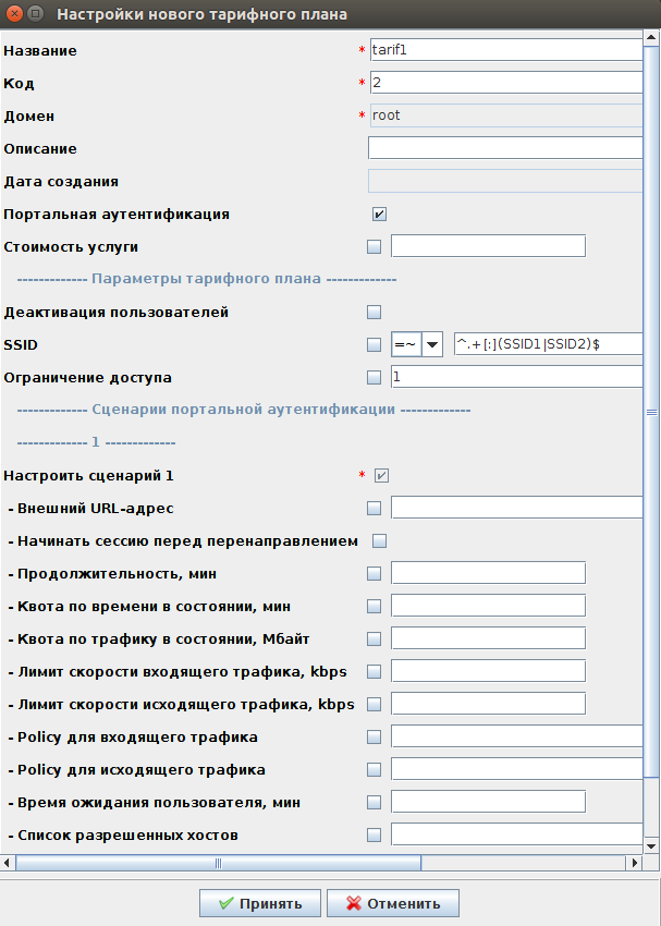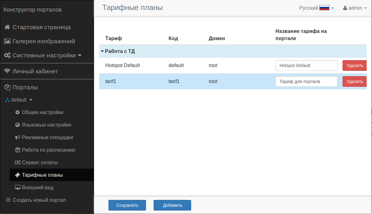 Откройте вкладку «Тарифные планы», нажмите кнопку "Добавить" и отметьте флагом созданный тарифный план «tarif1».