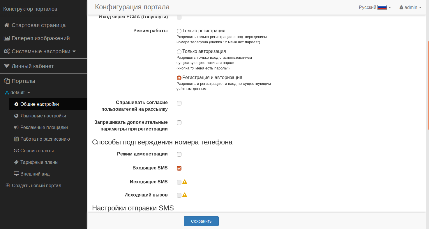 Режимы работы портала и способы подтверждения номера телефона настраиваются в меню «Общие настройки» разделы «Режим работы» и «Способы подтверждения номера телефона» По умолчанию установлен режим работы «регистрация и авторизация», а для подтверждения номера телефона при портальной авторизации включены два способа: «Режим демонстрации» и «Входящие SMS». Демо-режим предназначен для тестирования, после ввода номера телефона генерируется код и автоматически подставляется в форму. При вводе системы в эксплуатацию снимите флаг в поле «Режим демонстрации».