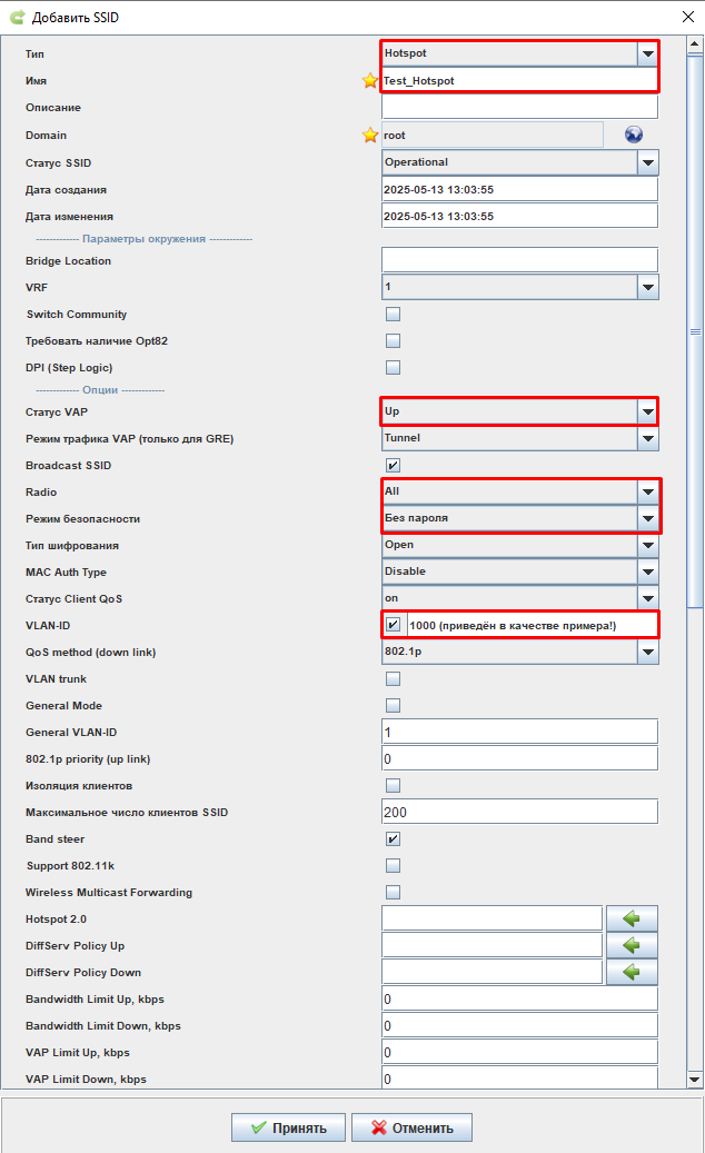 VLAN-ID = 1000 используется в качестве примера. Здесь необходимо указать VLAN услуги, который реально используется на Вашей сети и приходит на точку доступа. В этом VLAN пользователям должен быть доступен DHCP сервер.