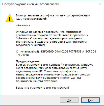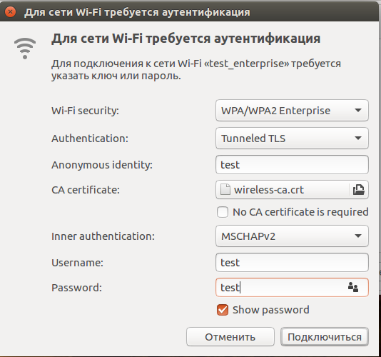 В качестве CA certificate выберите корневой сертификат wireless-ca.crt