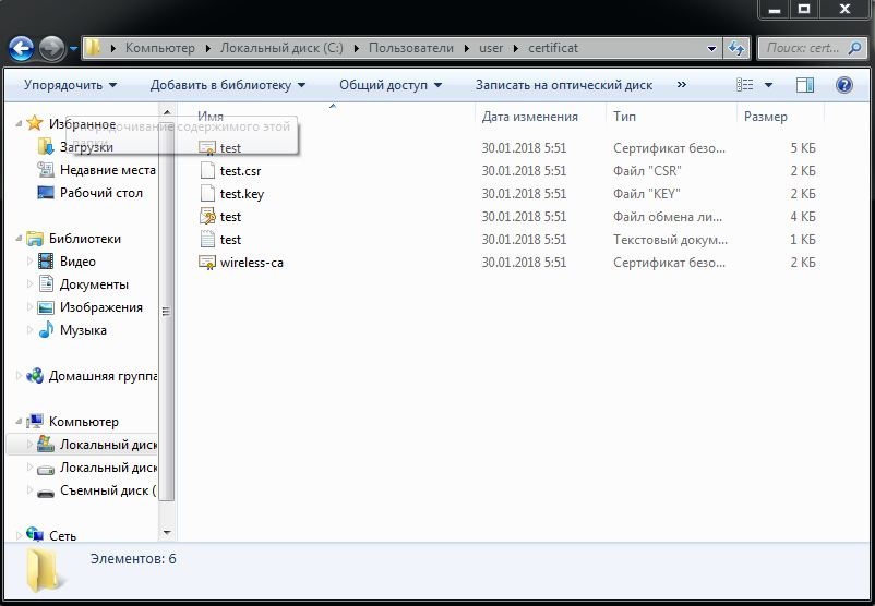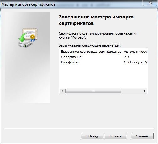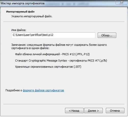 Установка пользовательского сертификата происходит аналогично установке корневого сертификата, только необходимо ввести пароль сертификата. Пароль соответствует параметру сертификата Password, который Вы всегда можете посмотреть в файле .txt