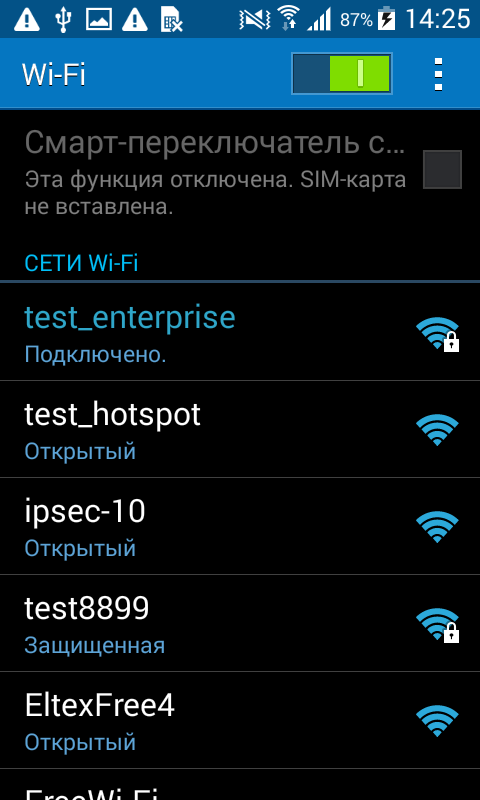 В меню Wi-Fi найдите созданный ранее SSID test_enterprise