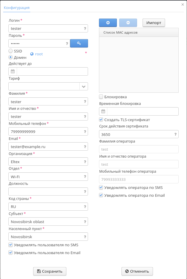 3. Задайте параметры пользователя и активируйте флаг "Создать TLS-сертификат".