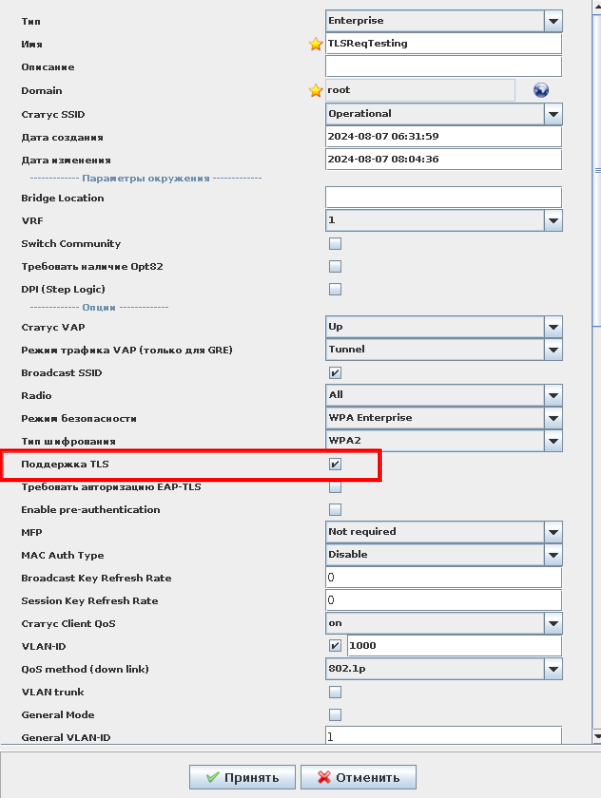 В случае, если вам необходима авторизация только по сертификатам, то активируйте флаг "Требовать авторизацию EAP-TLS"