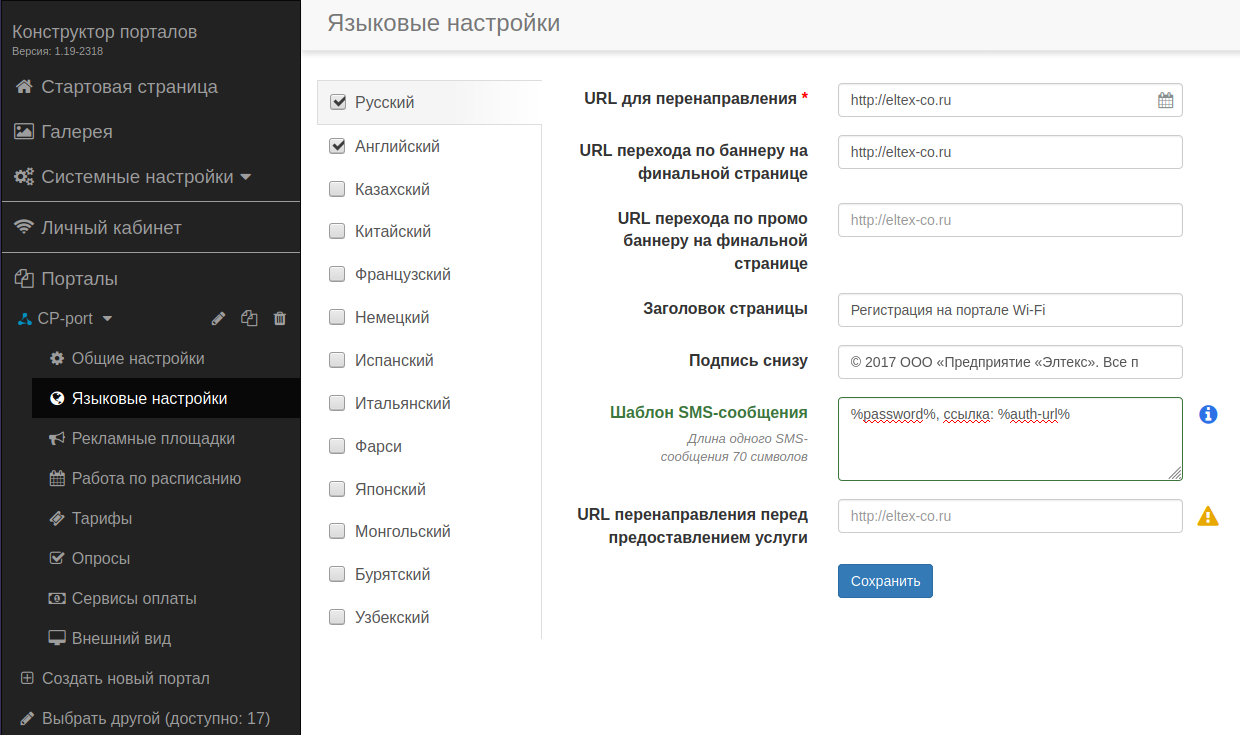 Для включения ссылки авторизации в SMS необходимо выполнить настройку шаблона SMS-сообщения. Для этого в конструкторе порталов, надо выбрать портал нужного пользователя, и перейдя в раздел "Языковые настройки" изменить поле "Шаблон SMS-сообщения" "%password% - код доступа к '%ssid%'. Логин: %phone%":