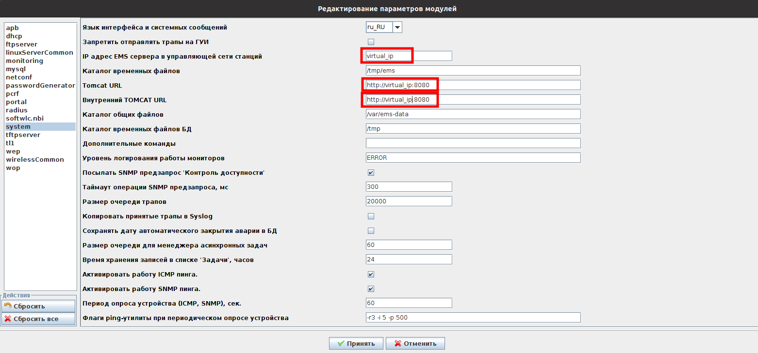 В графическом интерфейсе сервера EMS изменить localhost (либо 127.0.0.1) на виртуальный ip-адрес в следующих разделах: