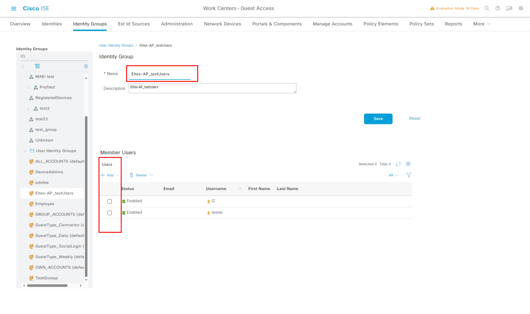 5.Создать группу встроенных гостевых учетных записей, в нашем случае это Eltex-AP_testUsers и в этой группе создать учетные записи, задать им логин и пароль.