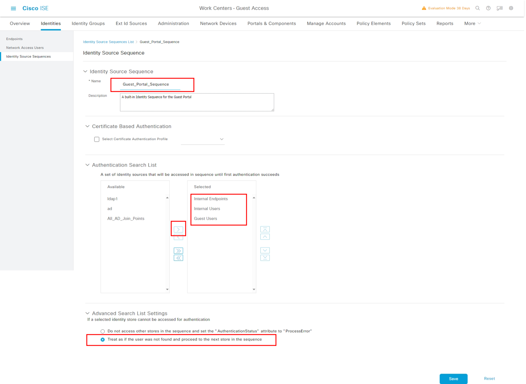 6.Настраиваем последовательность действий для гостевого портала (Guest Portal Sequence). Переходим в настройки Work Centers > Guest Access > Identities > Identity Source Sequence > Guest Portal Sequence - это предустановленная последовательность аутентификации гостевых пользователей. И в поле Authentication Search List выбираем порядок аутентификации пользователей. В нашем случае порядок как на снимке ниже: Internal Endpoints (MAB) → Internal Users (встроенные учетные записи) → Guest Users (учетные записи созданные пользователем самостоятельно на гостевом портале)