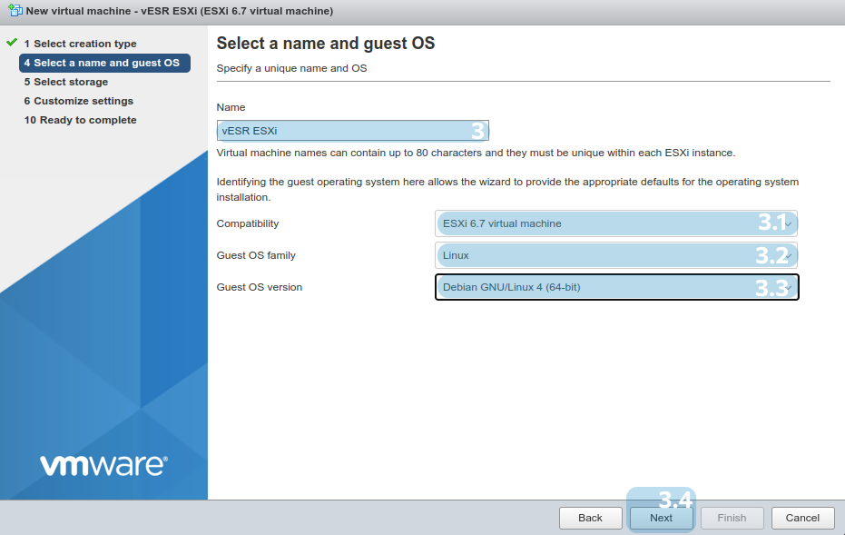 Шаг 5. Выберите Virtual Hardware для будущего vESR, обязательно не менее 3 ГБ RAM (оптимально 4 ГБ) и не менее 500 МБ хранилища. "SCSI Controller" должен быть выставлен в "LSI Logic Parallel". "Controller location" для "Hard Disk" выставите в "IDE controller". По необходимости добавьте сетевые интерфейсы.