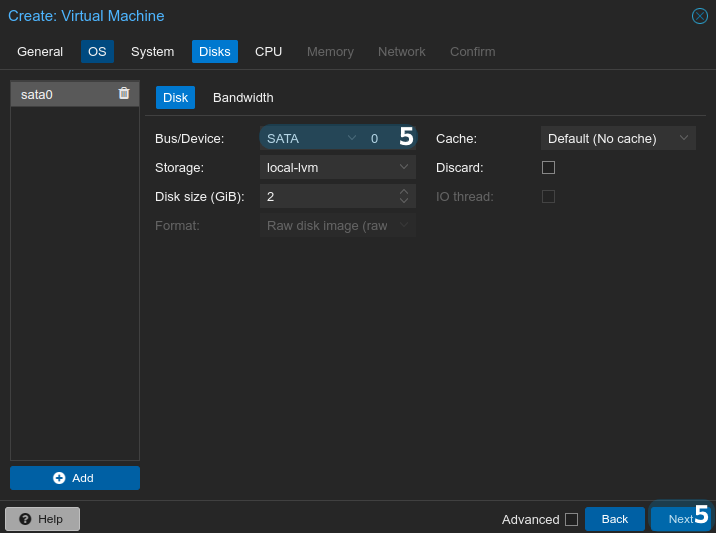 Шаг 5. В качестве "Bus/Device" укажите "SATA", размер диска должен быть не менее 500 МБ. Нажмите "Next":