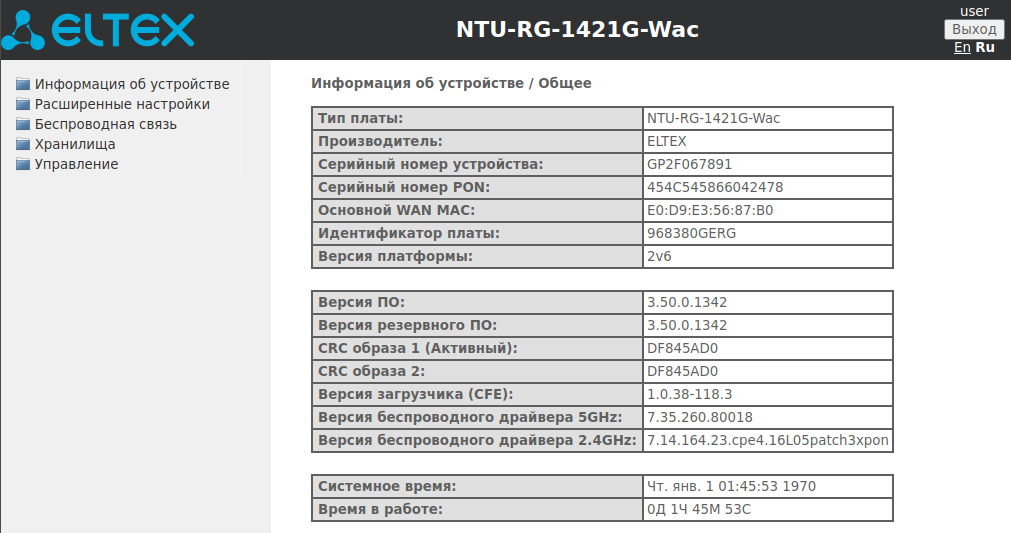 Для перезагрузки устройства необходимо нажать на кнопку «Перезагрузить». Перезагрузка устройства может занять несколько минут.