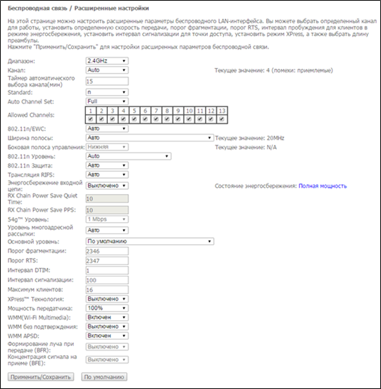 • Энергосбережение входной цепи – настройка толерантности при выборе режима работы (20Мгц или 40Мгц). Если параметр в состоянии «Включен» – будет выбран оптимальный режим работы устройства, учитывая «Полосу пропускания», иначе режим работы будет зависеть только от параметра «Полоса пропускания»;