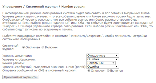 • Системный журнал – включение/выключение системного журнала (enable/disable);