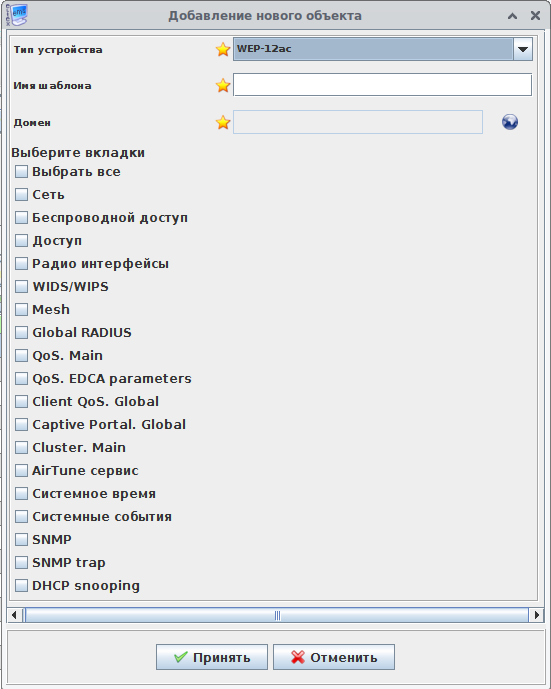 Для корректной работы ранее сконфигурированных шаблонов, использующих вкладку "Беспроводной доступ" необходимо их открыть кнопкой "Редактировать" и нажать "Принять". При необходимости выполнить настройку параметров Option 82 во вкладке "DHCP snooping".
