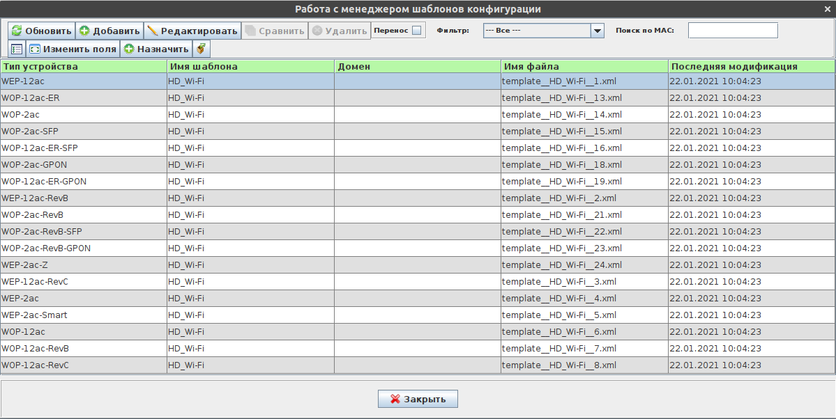 Выбор нескольких устройств осуществляется при нажатой клавише "Ctrl". Шаблоны можно назначать только на точки доступа того типа, для которого создан шаблон.