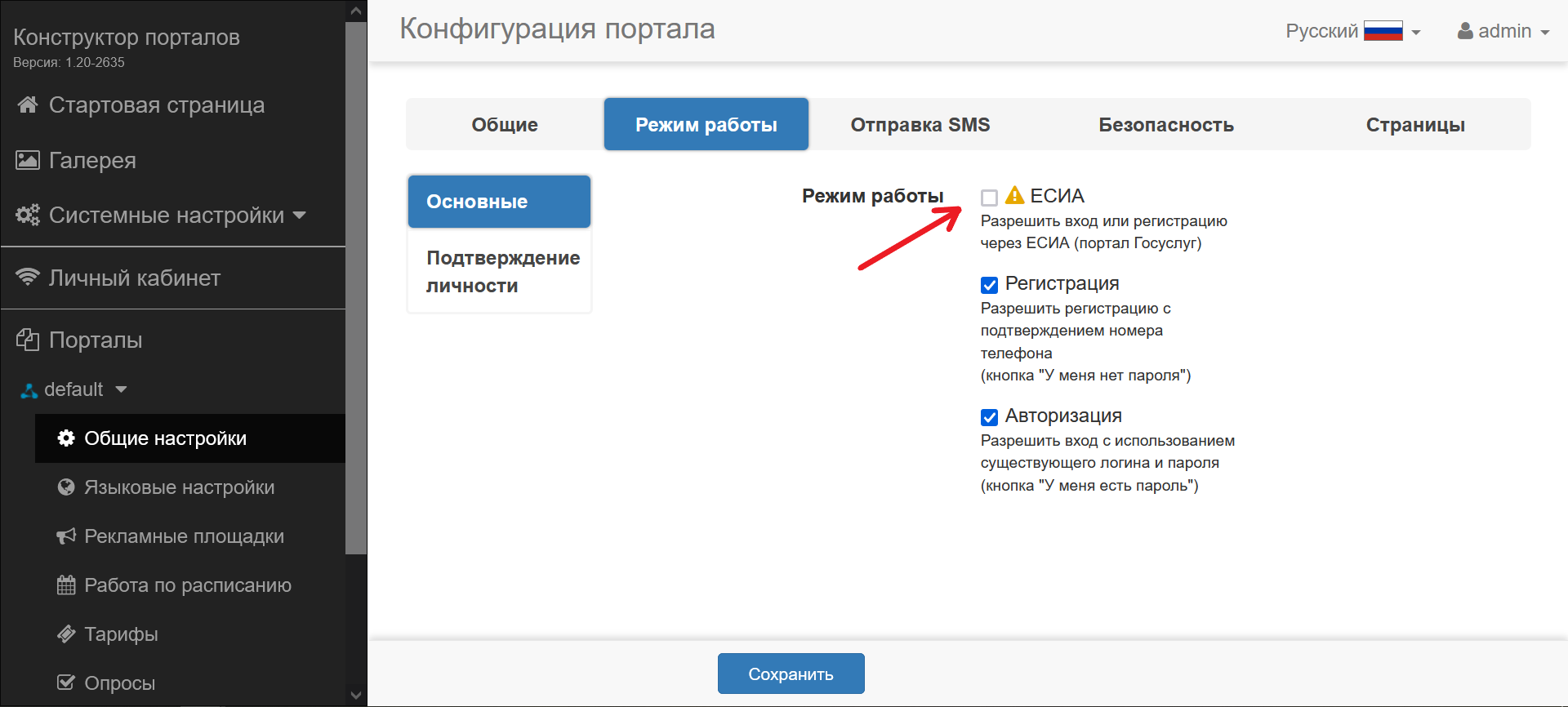 В конструкторе в разделе "Вход через ЕСИА" включить интеграцию и указать необходимые параметры