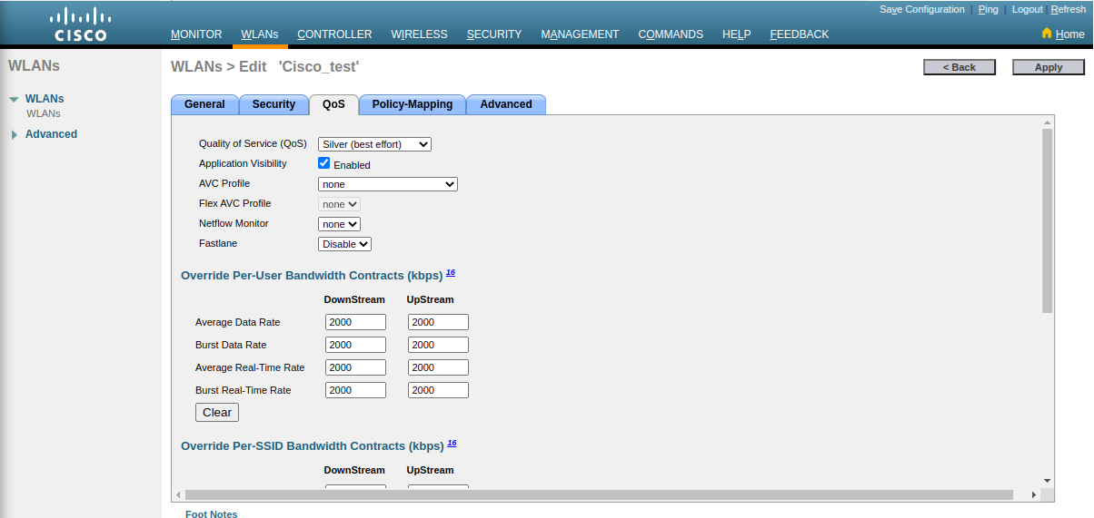 Так же можно выставить значение QOS для каждого SSID, указывая значения Override Per-User Bandwidth Contracts (kbps)