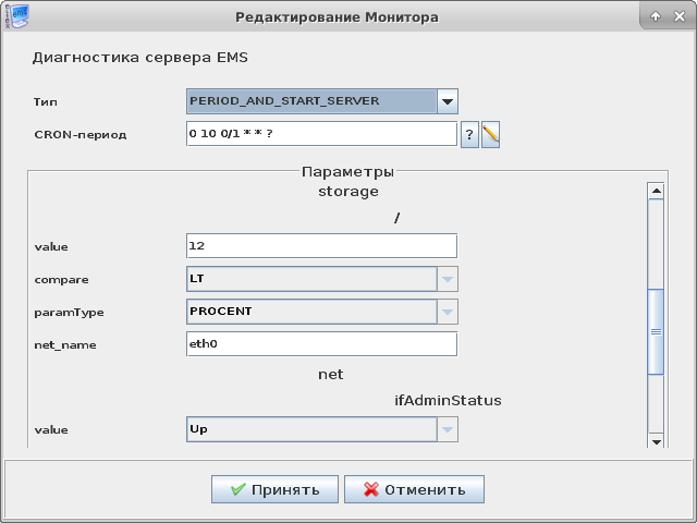 Зайдите в меню Администрирование/Настройка сервера/Задачи по расписанию (мониторы), выберите монитор Диагностика сервера EMS ID=8 и нажмите кнопку "Редактировать".