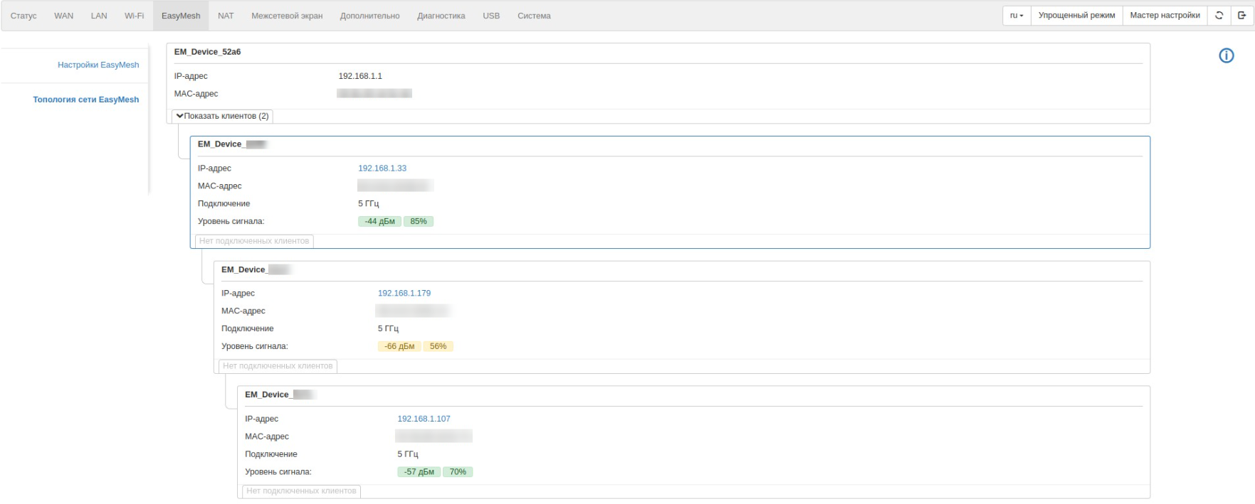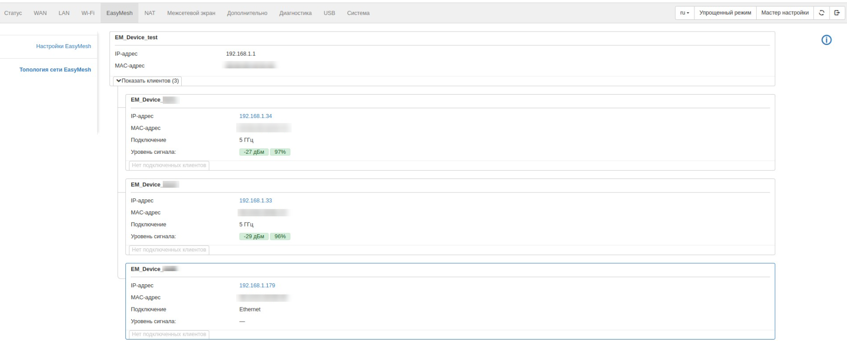 Рисунок 5. Отображение топологии EasyMesh-сети при подключении агентов по схеме "Звезда"