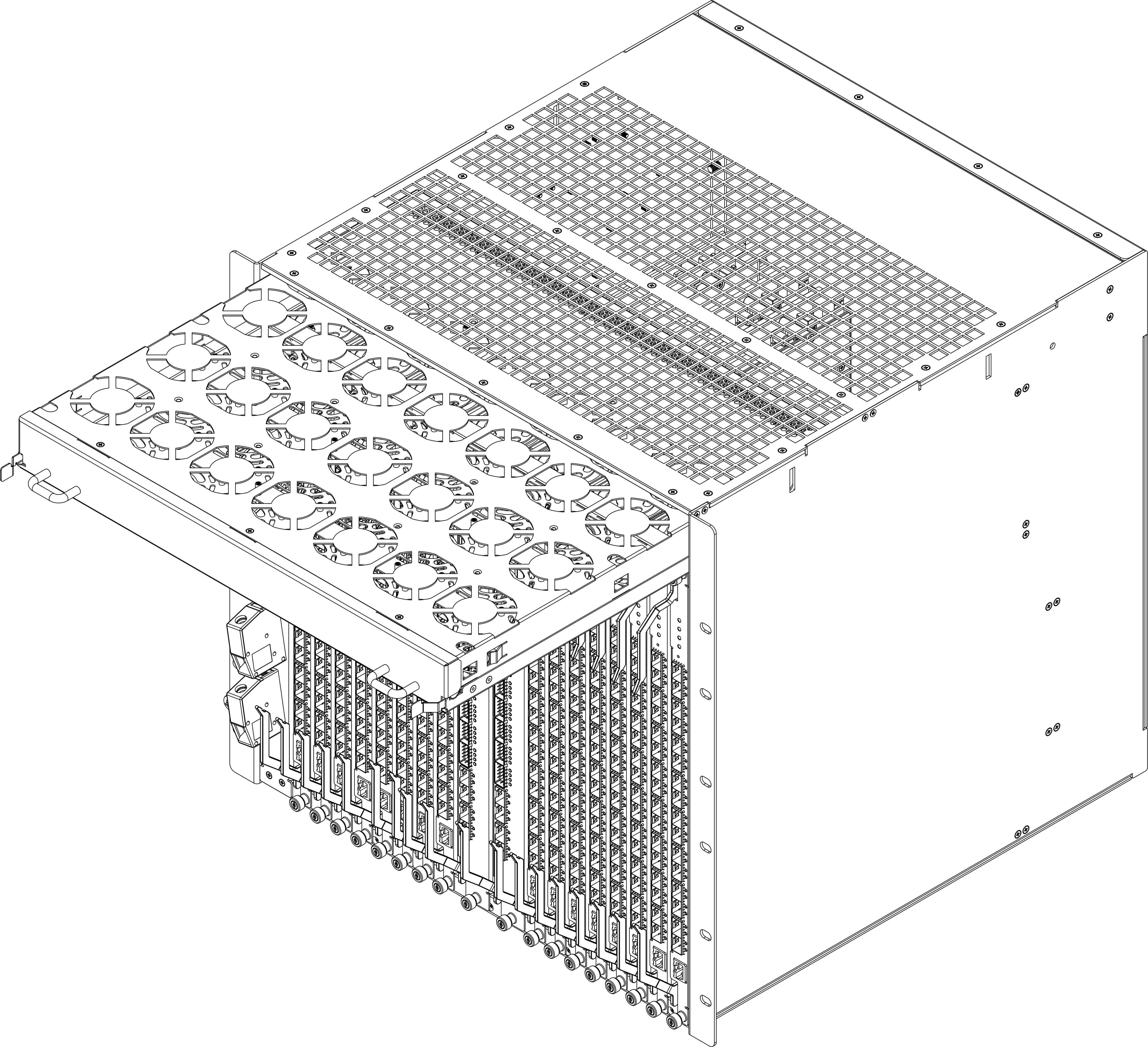 Система поддержания температурного режима устройства ориентирована на использование в сочетании с системой кондиционирования аппаратного зала по принципу «горячего» и «холодного» коридора. Система вентиляции состоит из модуля вентиляционной панели, расположенного в верхней части шасси (см. рисунок 24), и контроллера, управляющего скоростью вращения вентиляторов. Модуль контроллера вентиляторов установлен внутри шасси. На верхней крышке корпуса шасси расположены вентиляционные отверстия.