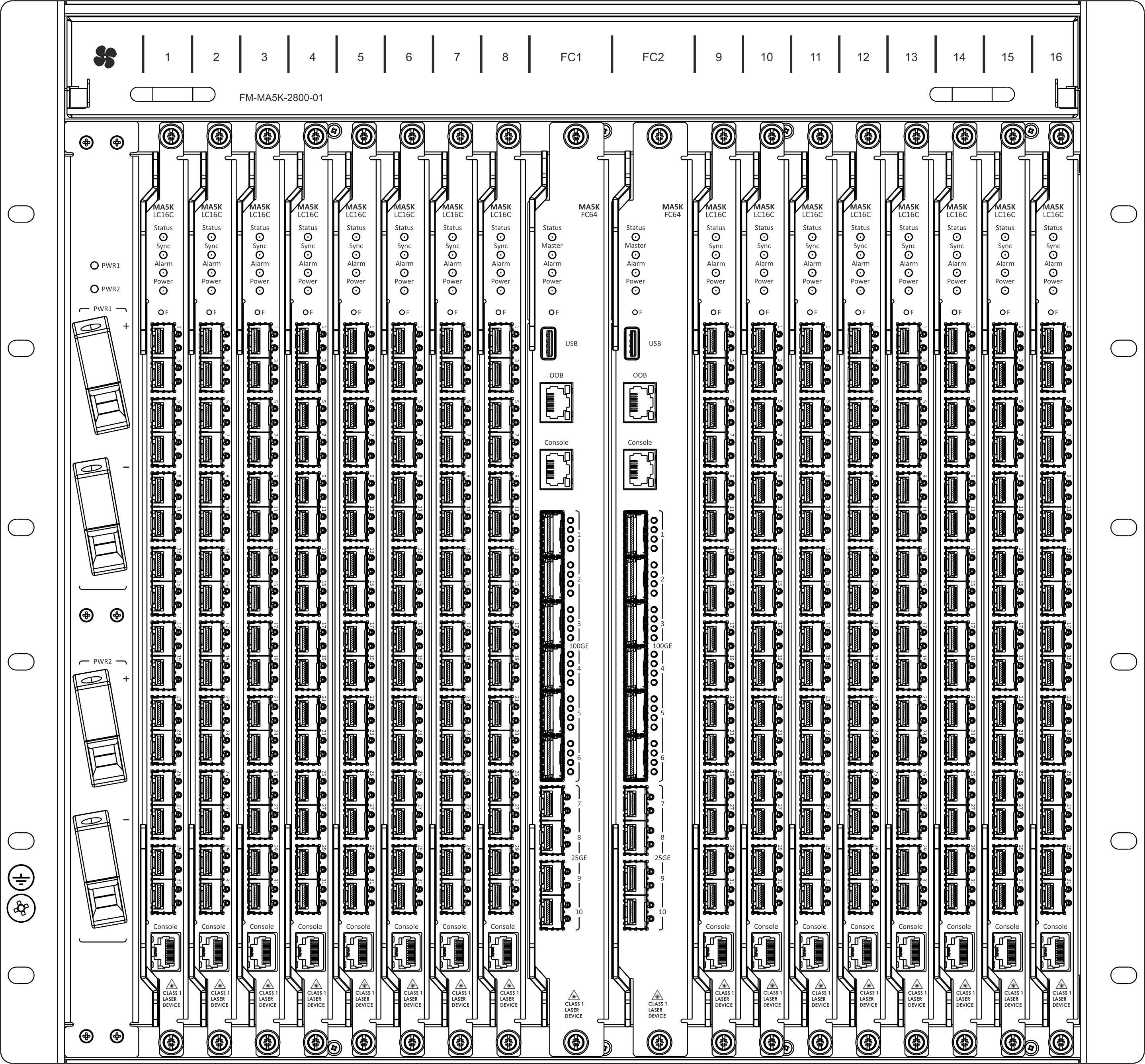 Устройство MA5160 выполнено в металлическом корпусе и состоит из 19” шасси высотой 11U. Шасси служит для объединения модулей различного функционального назначения, обеспечивая их взаимодействие через высокоскоростные линии связи 100 Гбит/с, а также для распределения питания, поддержания и мониторинга температурного режима всего устройства.