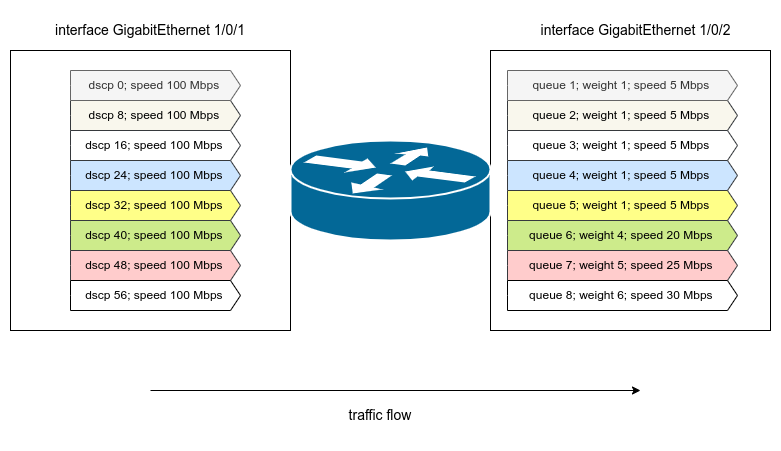 Перенаправим трафик с DSCP 22 в первую приоритетную очередь: