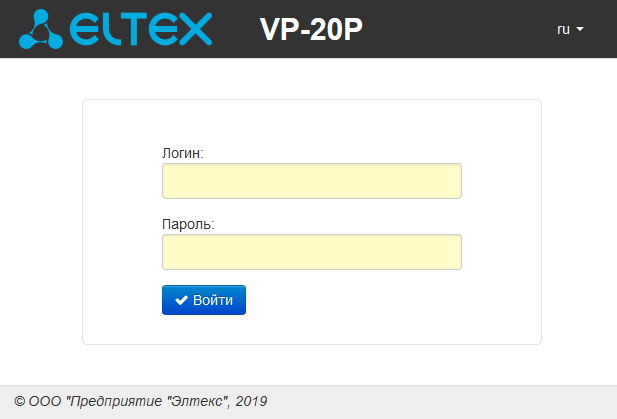 При успешном подключении к устройству появится окно с запросом логина и пароля. Заполните поля и нажмите кнопку «Войти».